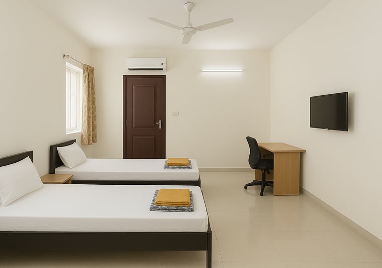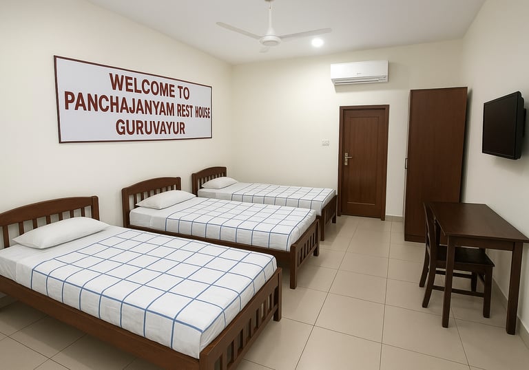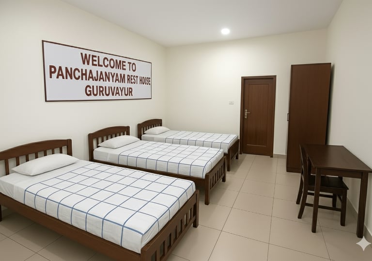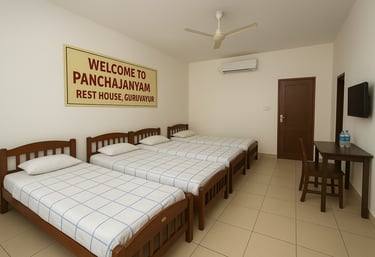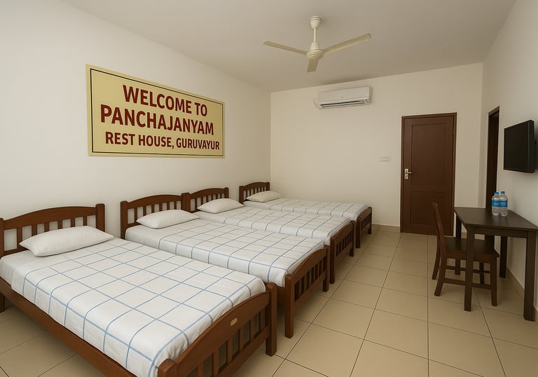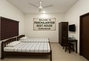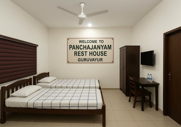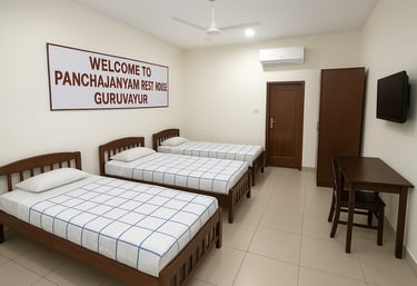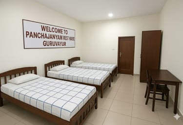 Welcome to Panchajanyam Rest House, one of the trusted and comfortable stay options near the sacred Guruvayur Sri Krishna Temple. We offer a peaceful, clean, and family-friendly environment for pilgrims visiting Guruvayur for darshan, weddings, poojas, and temple festivals.